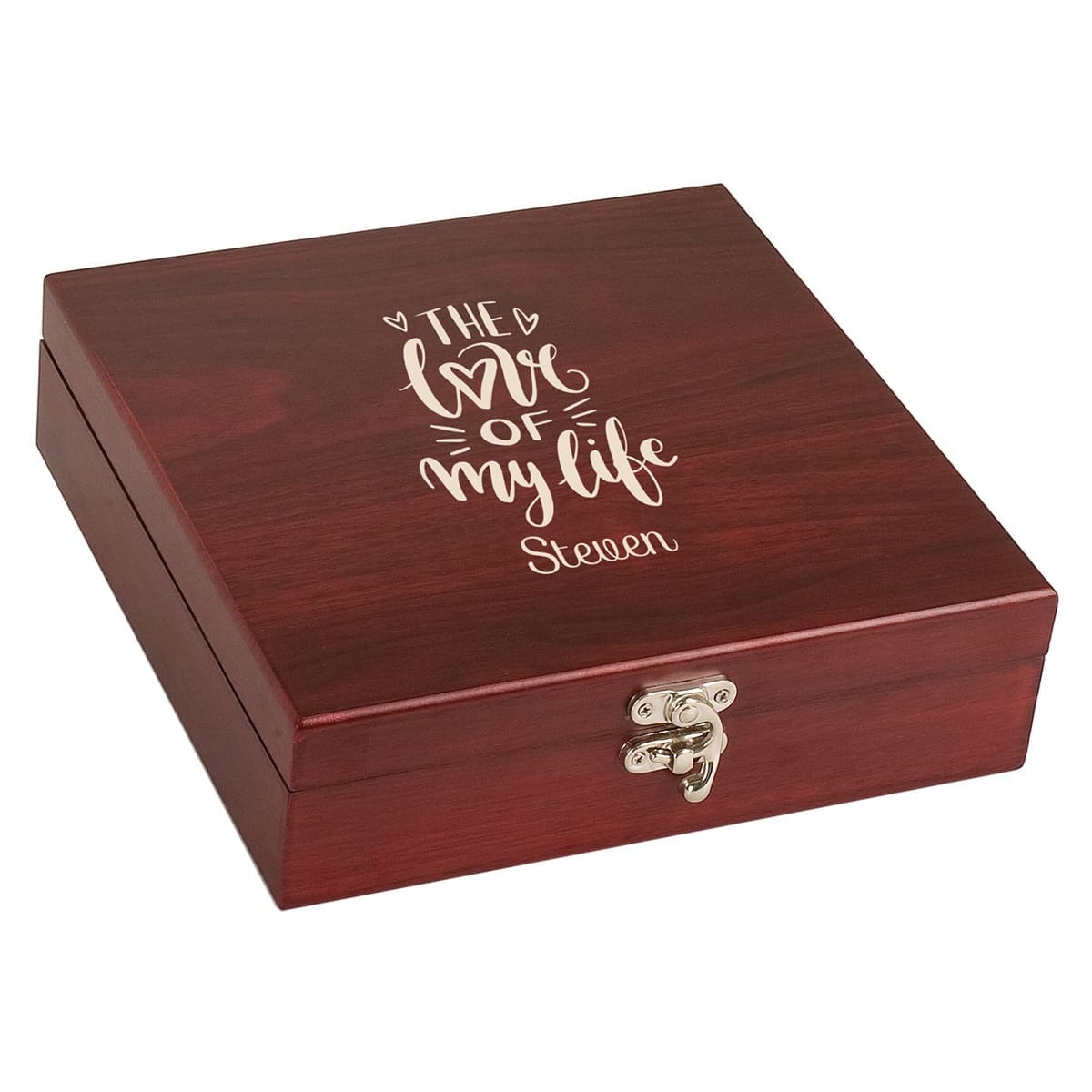 This 10 3/4″(L) x 8 3/4″(W) x 2 3/4″(H) personalized laserable rosewood finish wine set is professionally laser engraved. The images will not rub, peel, or scratch off.