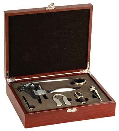 > 10 3/4″(L) x 8 3/4″(W) x 2 3/4″(H) personalized laserable rosewood finish wine set.